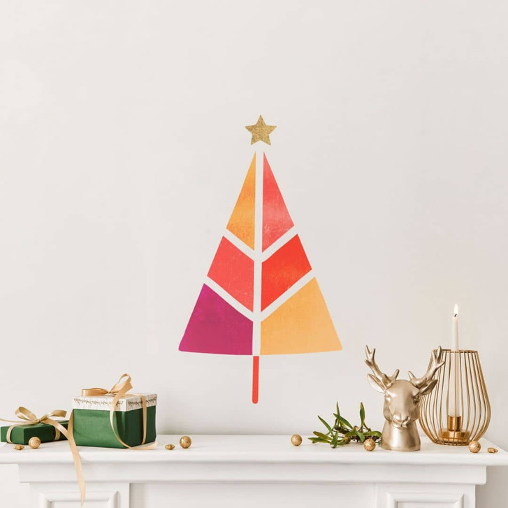 Bringe den Zauber von Weihnachten mit einem modernen und lebendigen Design in dein Zuhause. Dieser Wandaufkleber in Form eines stilisierten Weihnachtsbaums besticht durch sein geometrisches Design und seine warmen, leuchtenden Farben. Der elegante goldene Stern an der Spitze setzt einen glänzenden Akzent, der den Baum perfekt abrundet. Dieses Dekorationsstück ist die ideale Wahl für alle, die traditionelle Weihnachtsmotive auf zeitgemässe Weise erleben möchten.
