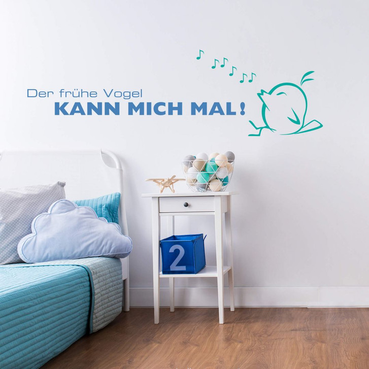 Mit dem witzigen Wandsticker „Der frühe Vogel kann mich mal 4“ (zweifarbig) bekommt das Sprichwort eine ganz andere Wendung und man kann selig weiter träumen. Der Wandsticker, der besonders im Schlafzimmer gut zur Geltung kommt, ist in 9 Grössen und 35 Farben erhältlich. Den lustigen Pfeifvogel und den Schriftzug kannst du in einer anderen Farbe bestellen, was dem Wandsticker eine zusätzliche dekorative Seite verleiht. Mit dieser Wanddekoration kannst du gut schlafen, denn auch der „Spätaufsteher“ kommt noch zu seinem Recht.