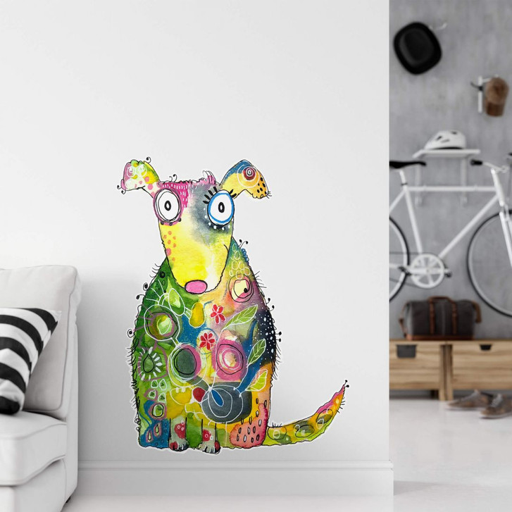 Das Motiv ist rundum mit einem weissen Rand (ca. 3 mm, je nach Motivgrösse) versehen! Das Wandtattoo mit dem bunten Hund ist in verschiedenen Grössen erhältlich.