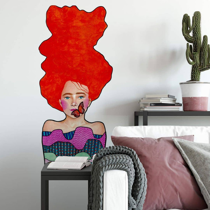 Um deinen Wänden einen neuen Look zu verpassen, brauchst du nur ein paar kleine Accessoires, die deine vorhandene Einrichtung ergänzen. Die farbenfrohen Illustrationen von Hülya Özdemir eignen sich dafür besonders gut. Diese junge Frau mit roten Haaren und einem Schmetterling im Gesicht ist ein Hingucker an der Wand.