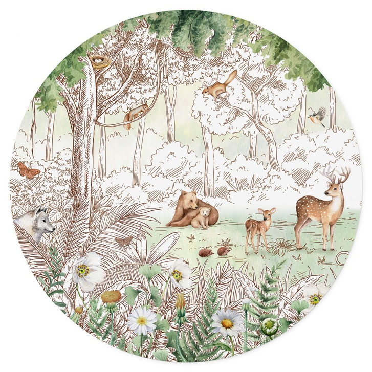 Mit der Naturillustration von Kikki Belle verwandelst du das Kinderzimmer in einen frühlingshaften Wald. Lass dein Kind die verschiedenen Wildtiere mit ihren Jungen entdecken. Hirsche, Bären, Eichhörnchen, Vögel, Igel und Wildschweine – für jeden Tierfreund ist etwas dabei. Das runde Motiv besticht durch seine natürliche Optik, die immer gut zur Inneneinrichtung passt.