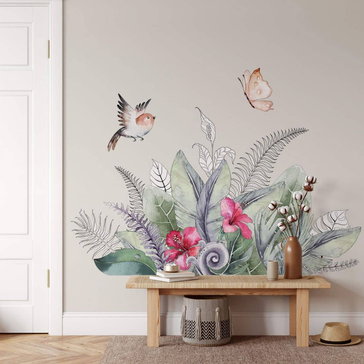 Das Wandtattoo ist in verschiedenen Grössen erhältlich. Die einzelnen Elemente, wie den Spatz und den Schmetterling, kannst du nach Belieben an der Wand anordnen.
