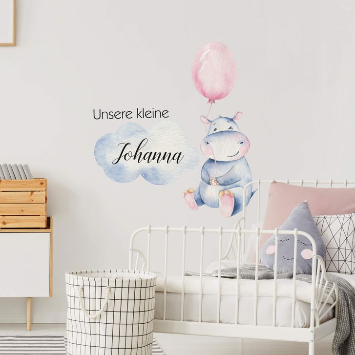 Wandtattoo Kvilis - Kleines Flusspferd mit rosa Luftballon & Wunschname Mädchen