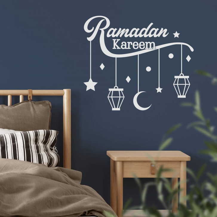 Ramadan Kareem – Gesegneter Ramadan: Mit diesen Worten wünscht man Familie, Freunden und Bekannten zu Beginn der Fastenzeit einen grosszügigen Ramadan. Fastenzeit: Der neunte Monat im islamischen Mondkalender ist der muslimische Fastenmonat. Wie wäre es mit einer passenden Deko-Idee für diesen besonderen Anlass? Der Ramadan-Schriftzug kommt als Sticker mit Mond, Stern und zwei Laternen in dein Zuhause. Das Gute daran: Das Wandtattoo lässt sich schnell und einfach auf deine Lieblingswand kleben.