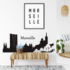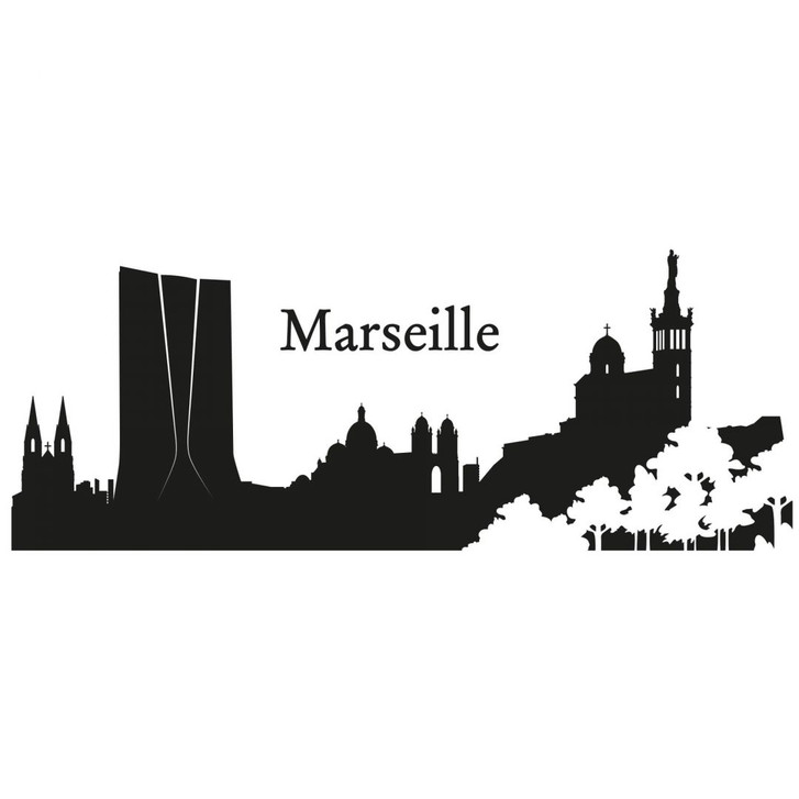 Die Skyline von Marseille zeigt Notre-Dame de la Garde, die Kathedrale von Marseille, den CMA CGM Tower und die Kirche Saint-Vincent de Paul (Marseille). Das Wandtattoo ist in verschiedenen Grössen und 35 verschiedenen Farben erhältlich.