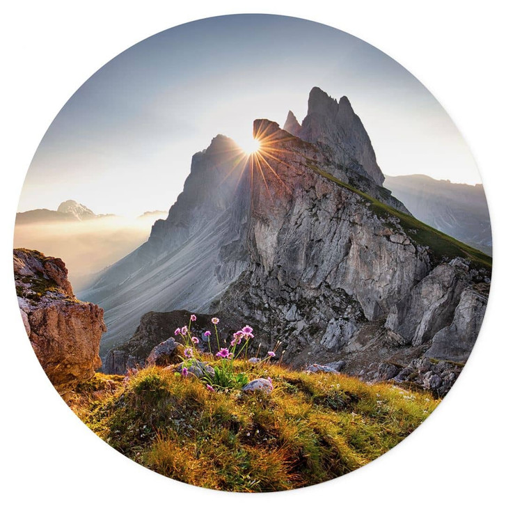 Dieser runde Wandsticker fängt die Magie eines Sonnenaufgangs über den mächtigen Gipfeln Südtirols ein. Die goldenen Sonnenstrahlen brechen durch die felsigen Gipfel und tauchen die Umgebung in ein warmes Licht. Im Vordergrund blühen zarte violette Blumen, die dem Bild eine lebendige Note verleihen und die raue Landschaft harmonisch abrunden. Das runde Format des Wandstickers bringt nicht nur Dynamik in Ihre Inneneinrichtung, sondern ist auch ein echter Hingucker, der jedem Raum eine besondere Atmosphäre verleiht. Dieser Wandsticker lässt sich leicht anbringen und entfernen und eignet sich ideal für Wohn-, Schlaf- oder Arbeitsbereiche. Er vermittelt die Ruhe und Schönheit der Berge und schafft eine inspirierende, friedliche Umgebung.