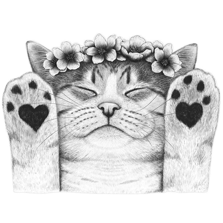 Dieses liebevolle Wandtattoo der Künstlerin Valeriya Korenkova bringt pure Harmonie und Freude in dein Zuhause. Das Motiv zeigt eine entspannte Katze mit geschlossenen Augen, einem bezaubernden Blumenkranz und herzförmigen Pfoten, die die Herzen von Tierliebhabern jeden Alters sofort erobern werden. Die feinen schwarz-weissen Details und die sanfte Ausstrahlung des Designs schaffen eine beruhigende Atmosphäre, die perfekt für ein Kinderzimmer ist.