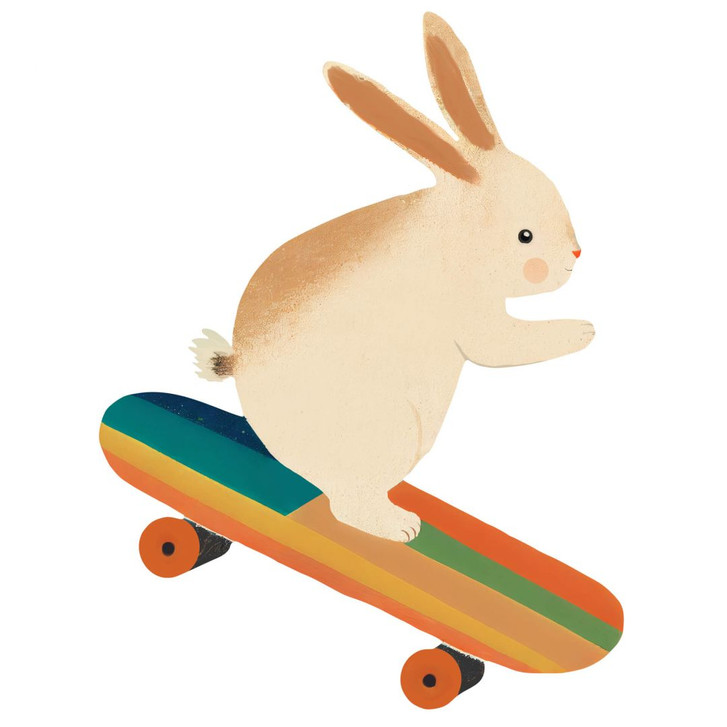Jedes Kind ist besonders und einzigartig. Umso wichtiger ist es, ihr Zimmer individuell zu gestalten. Die Welt der Kleinen ist bunt, fantasievoll und vielfältig – mit dieser Wanddekoration holst du dir ein Stück Kreativität an deine Wand. Der Kunstdruck von Treechild ist perfekt für ein Kinderzimmer. Das kleine weisse Kaninchen fährt gekonnt auf einem bunten Skateboard herum.