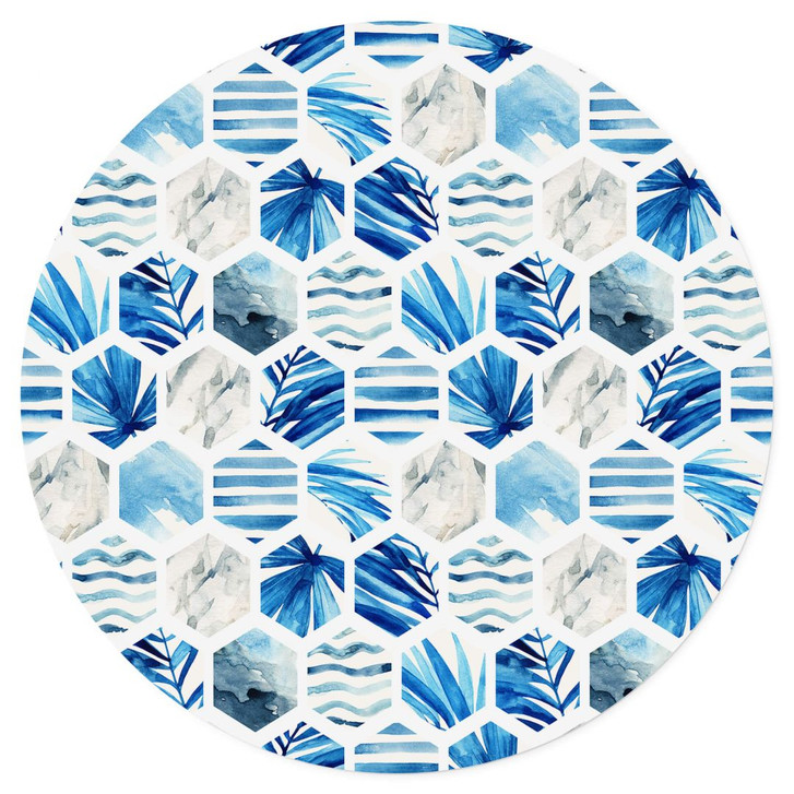 Wenn du ein wenig Abwechslung in deine Räume bringen möchtest, ist diese Illustration die richtige Wahl! Die runde Form lenkt die Aufmerksamkeit besonders auf den ausgewählten Bildausschnitt und schafft so ein schönes Gesamtbild. Träum dich ins Blaue! Das blaue Aquarellbild zeigt illustrierte Sechsecke mit Wellenlinien und tropischen Pflanzen und Blättern. Das sommerliche Motiv eignet sich beispielsweise für das Badezimmer und das Wohnzimmer, wo es die richtige Stimmung für die warme Jahreszeit schafft. Ob als Einzelmotiv oder in Kombination mit anderen Motiven, mit dem runden Sticker lässt sich die perfekte Wandgestaltung mit maritimem Thema kreieren.