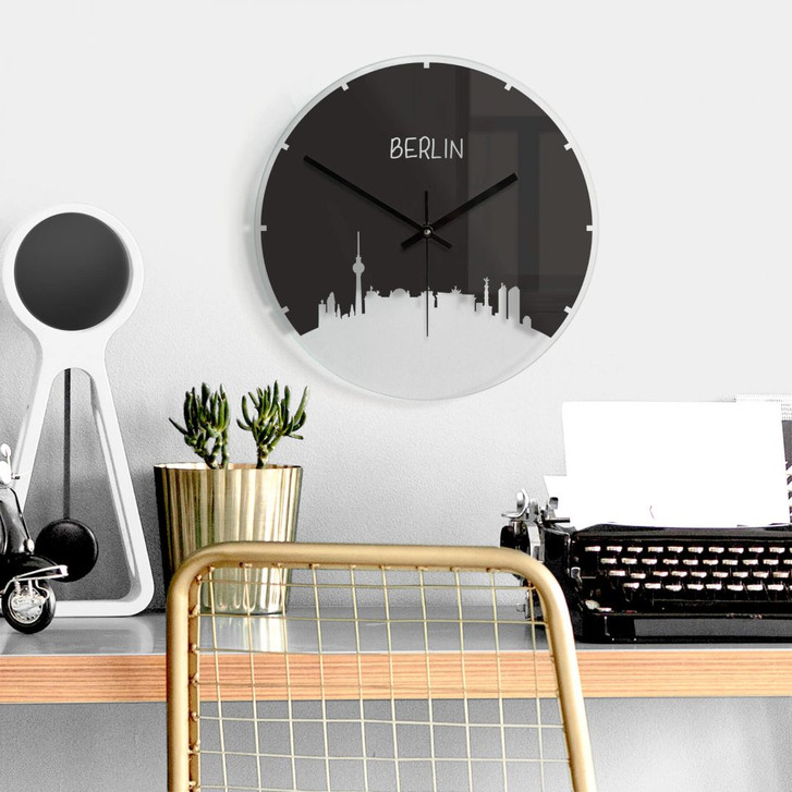 Präsentieren Sie mit dieser Uhr Ihre Lieblingsstadt Berlin! Die Hauptstadt Deutschlands ist mit ihren zahlreichen Sehenswürdigkeiten und Ausflugszielen immer eine Reise wert. Mit der berühmten Skyline von Berlin werden Büro- oder Wohnräume zu einem besonderen Ort gestaltet.